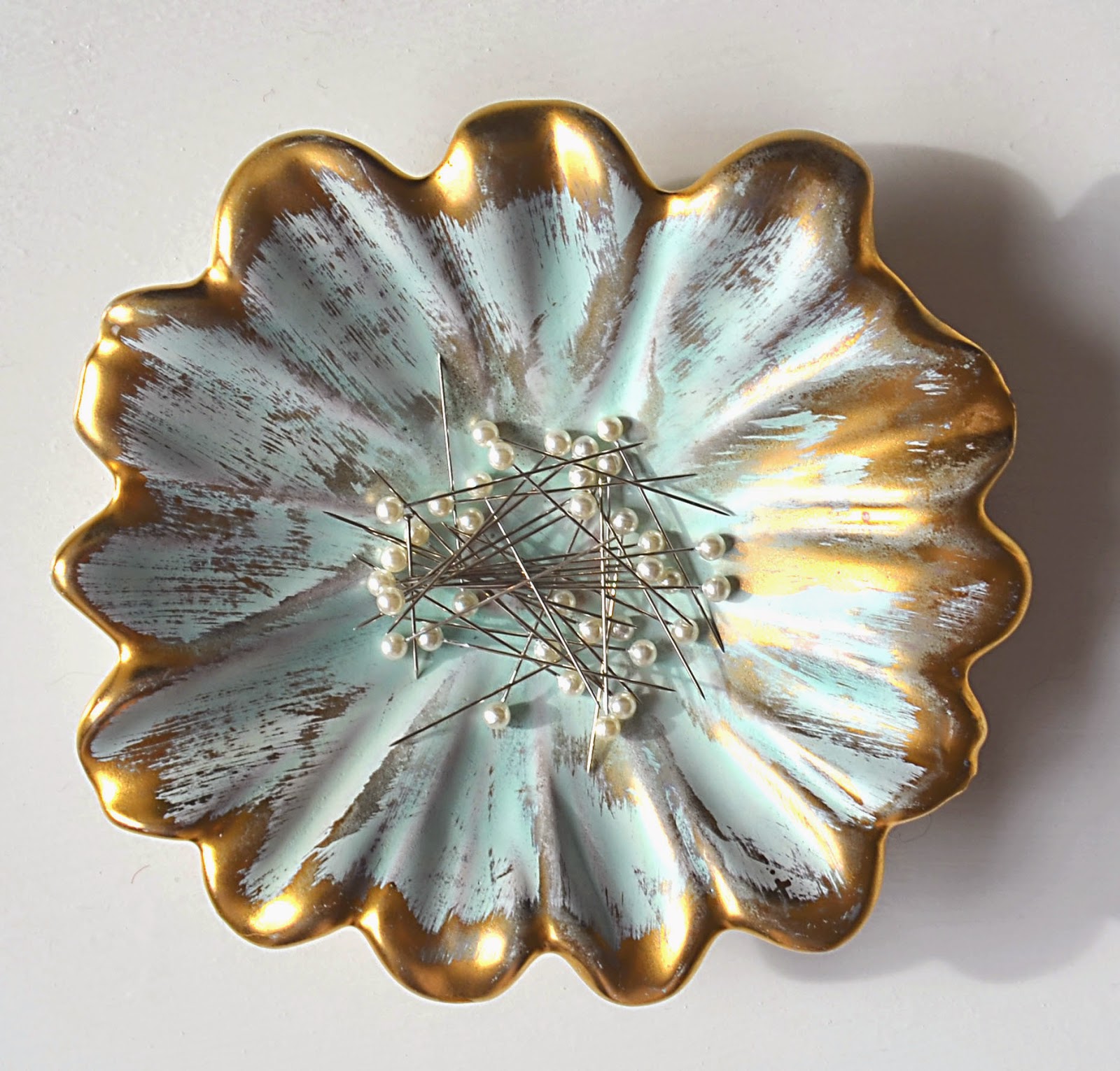 I found a little, funky vintage bowl in an antique store for a few dollars. I was using it as a place to keep my rings/jewelry/keys. Then I came across Miranda Walker's great idea to use a teacup saucer as a pin holder. I thought my bowl would make a perfect pin keep. I love anything retro.