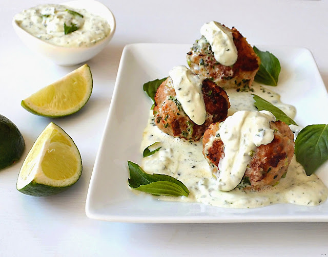Put the coconut cream and basil into the bowl of a food processor. Squeeze some lime juice and salt to taste. Whiz to puree. Place in the fridge to chill. You can make the sauce right before you make the meatballs or several hours ahead of time or even a day before you plan to serve it. It gets thicker as it chills.